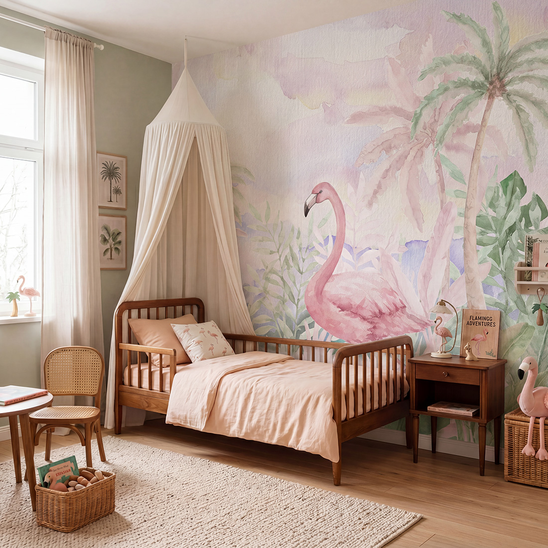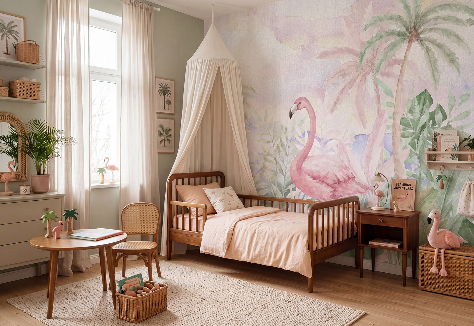 Tapeta flamingi do pokoju dziecka świetnie sprawdzi się w aranżacjach w stylu boho, naturalnym i pastelowym. Róże, zielenie i beże pięknie komponują się z jasnymi meblami, drewnianymi dodatkami i przytulnymi tekstyliami, tworząc harmonijną i ciepłą przestrzeń.