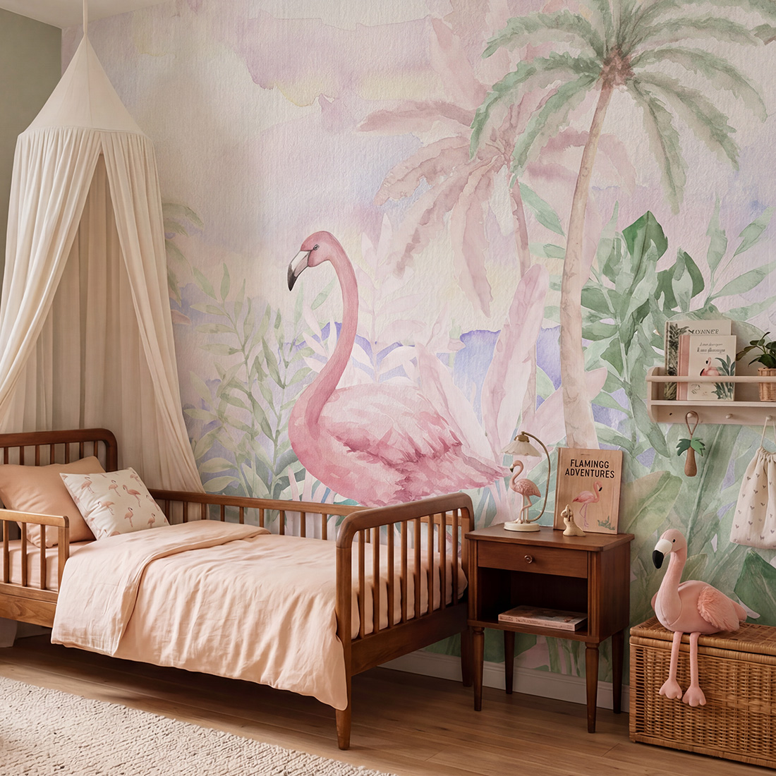 Tapeta do pokoju dziewczynki – FLAMINGI– zamienia zwykłe wnętrze w pastelową, tropikalną przestrzeń inspirowaną naturą.