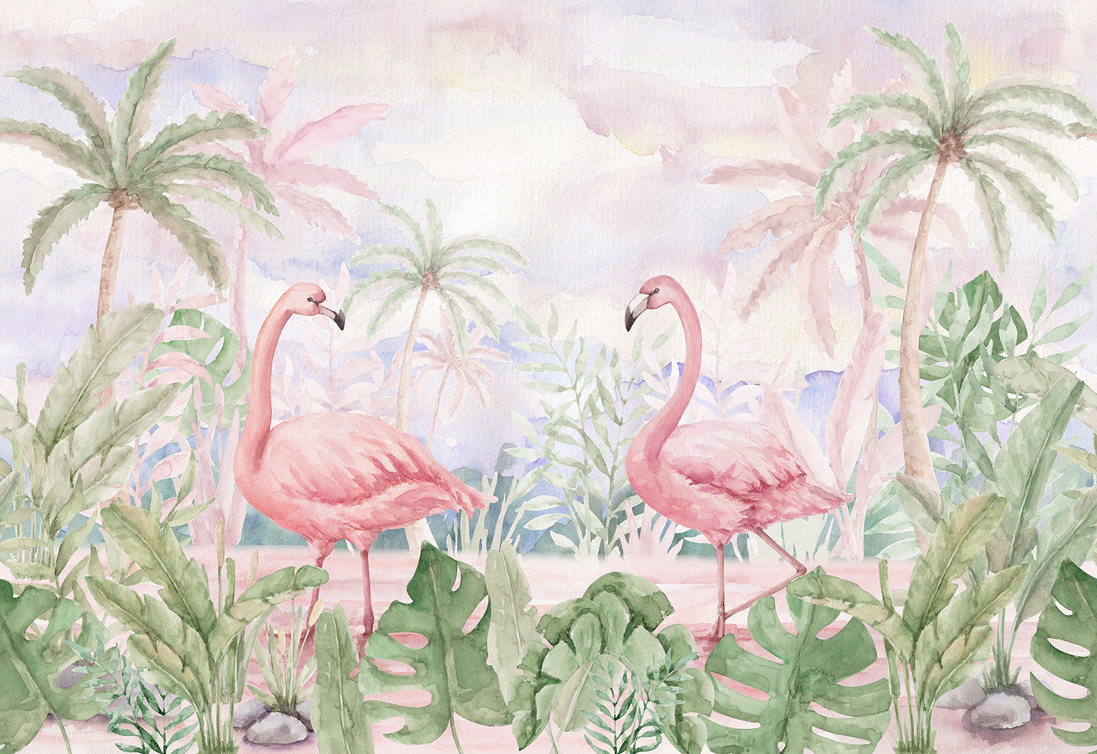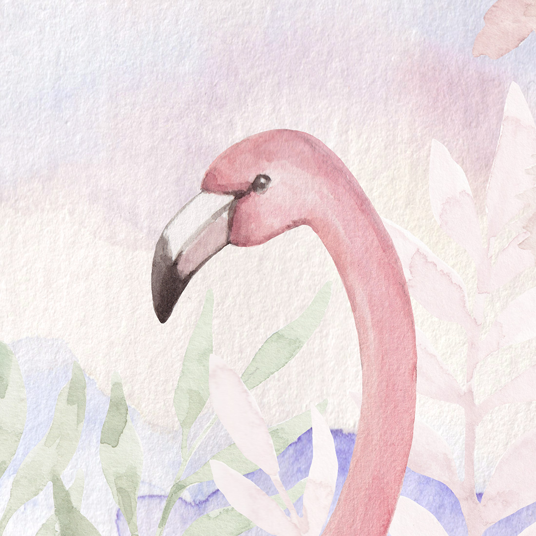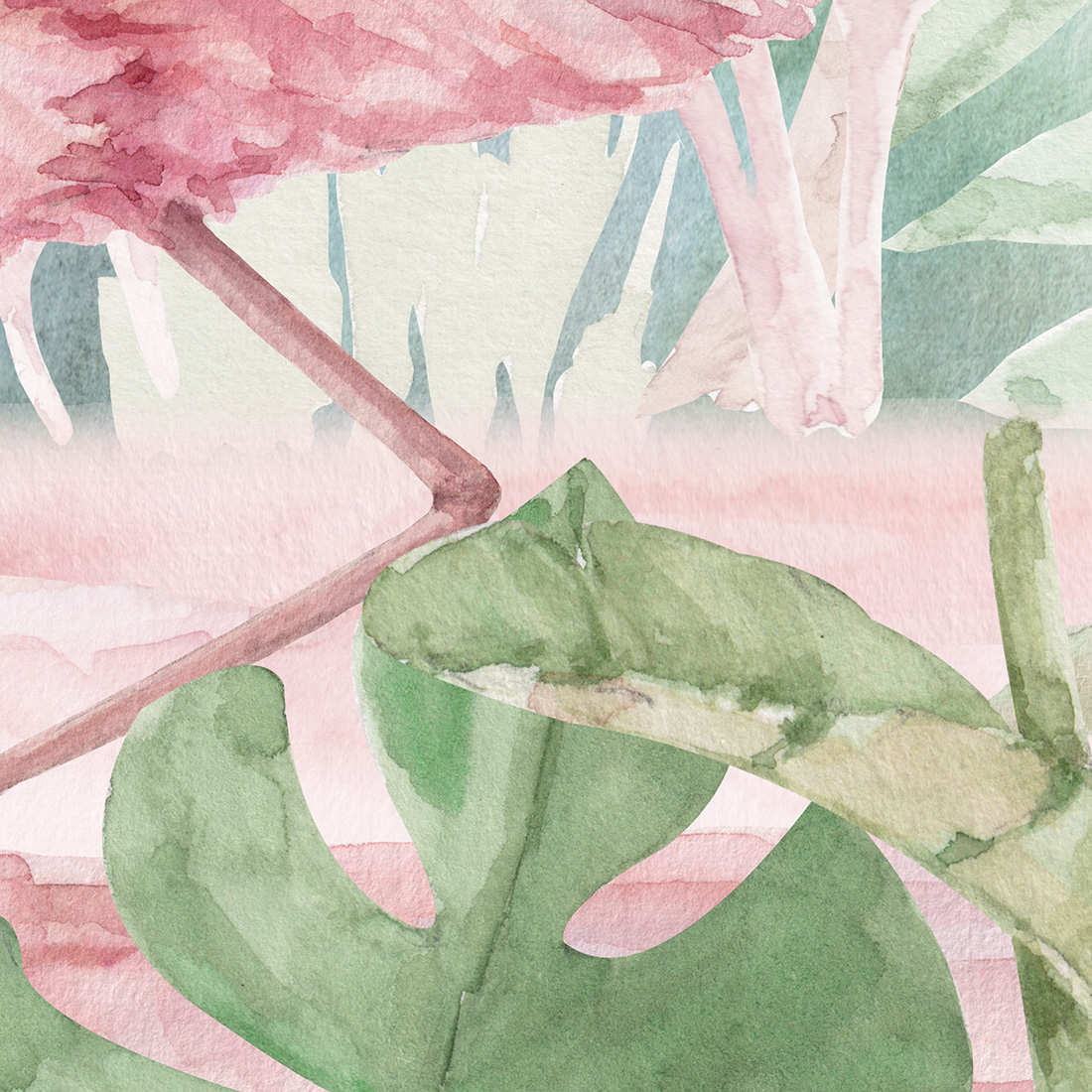 Delikatne flamingi spacerujące wśród palm i subtelnej roślinności tworzą spokojny, bajkowy klimat sprzyjający wyciszeniu, relaksowi i dziecięcej wyobraźni.