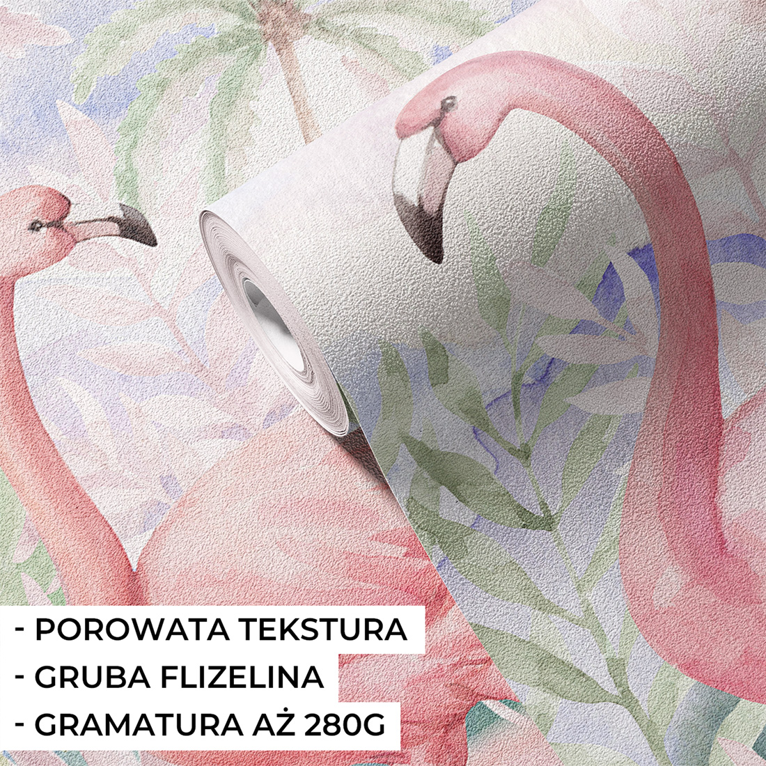 Próbka tapety flamingi o wymiarze 50x20 cm. Pozwala sprawdzić jak tapeta prezentuje się w rzeczywistości. Przestawia pełną grafikę tapety oraz dwa detale. Umożliwia to sprawdzenie wysokiej jakości wykonania i kolorystyki.
